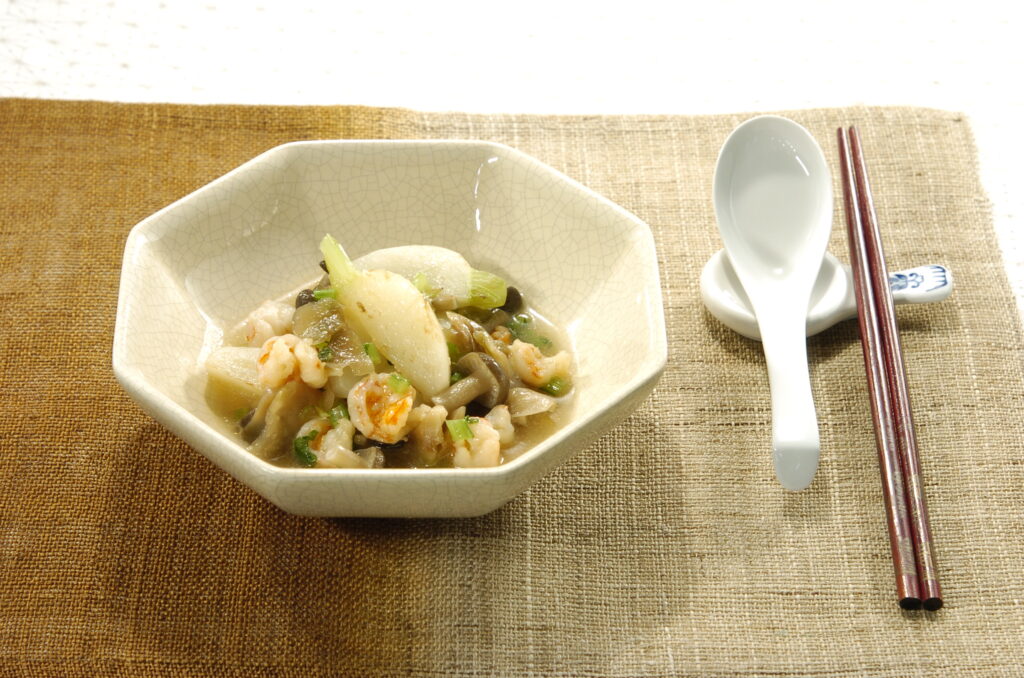 (5)かぶに火が通ったら、えび、かぶの茎を加えて中火で約1分煮て味を調え、おろししょうが、ごま油を加えてひと煮立ちさせ、器に盛る。