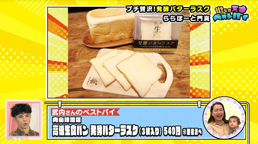 生後9ヵ月のお子さんを連れた女性のベストバイは、味噌の老舗・内山味噌店の高級生食パン発酵バターラスク。味噌麹を天然酵母として焼き上げた高級生食パンを使っており、発酵バターの豊かな風味と、控えめな甘さが特徴です。このおいしいラスクを女性は、「娘をお昼寝させたあとにホッとするとき1人で食べる」そうです!