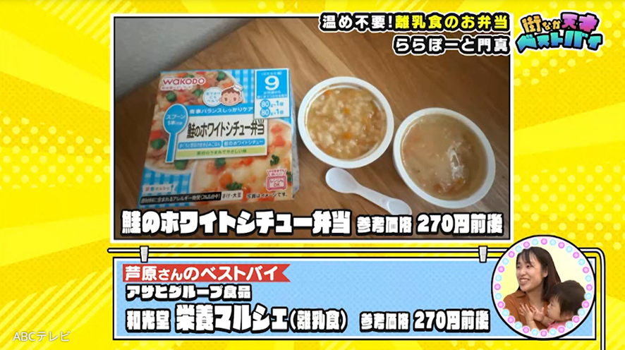 ますみとりえちゃんが最後に話を聞いたのは、マタニティ・ベビー専門店アカチャンホンポ主催の「ハイハイレース」で1位になった赤ちゃんのママ。ママのベストバイは、和光堂の離乳食弁当です。温め不要ですぐ食べさせることができ、スプーンもついていて非常に便利! ちなみに優勝した赤ちゃんは、まぐろと野菜の炊き込みごはんと、鮭のホワイトシチューが詰合せになったお弁当を食べてレースに臨んだそうです!