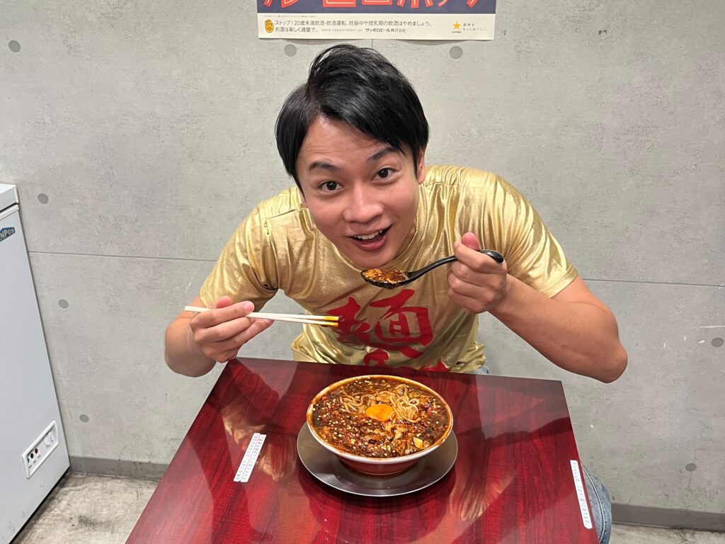 “酸辣ヂャン麺”は器に表面張力ギリギリまであんがのっており、ド迫力のインパクトだ。雑誌で見てもらうと見開きいっぱいに掲載されており、美味しさが観ている側にも伝わってくる。横山アナはこの日のリポートに一張羅のゴールド“麺馬鹿シャツ”で臨んでいるが、ゴールドに輝く“麺馬鹿シャツ”よりも、横山アナの顔ほども大きさがある“酸辣ヂャン麺”の器の大きさに目をひかれてしまう。