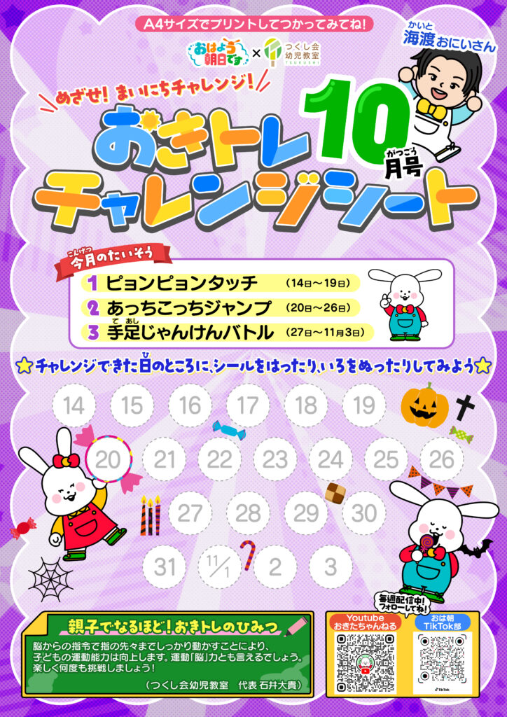 チャレンジシートは『今月のたいそう』に合わせて毎月更新! YouTube【公式】おきたちゃんねるよりダウンロード可能。