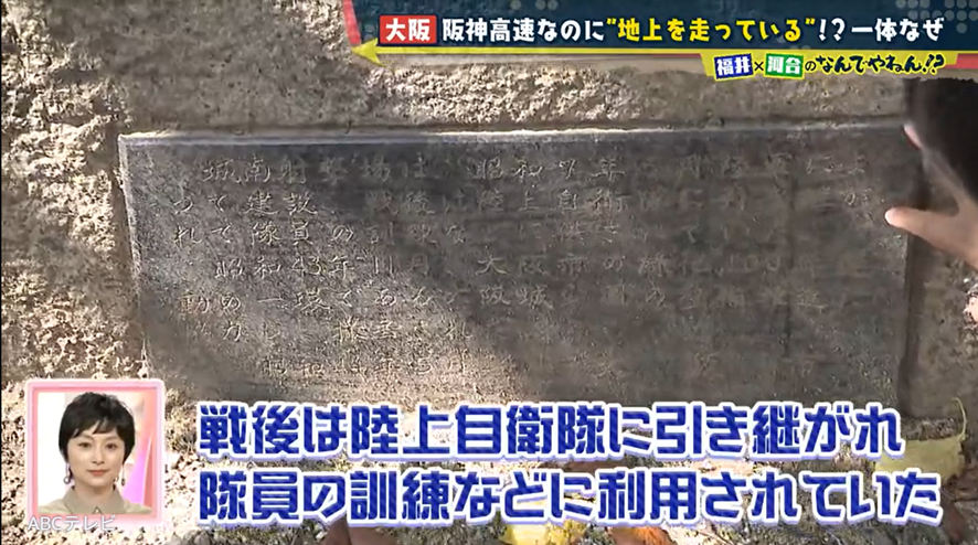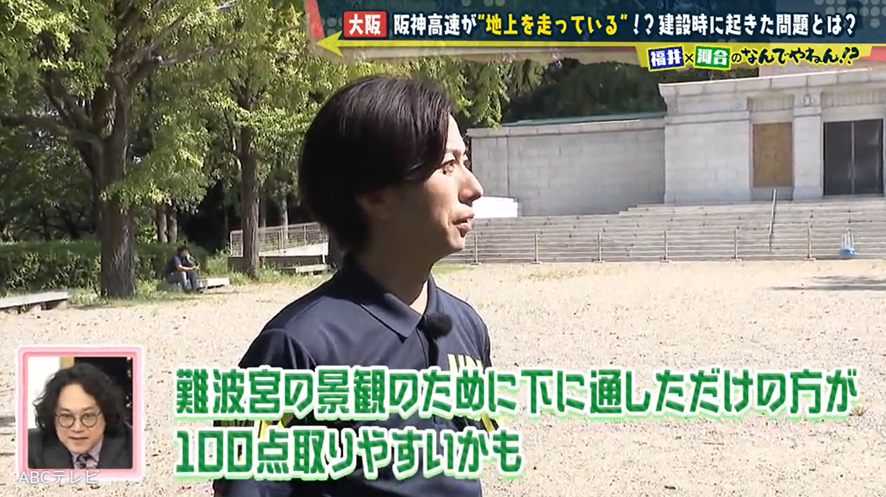 車から降りた河合は、高速の真横にある大阪城公園を福井アナと調査するなかで、「景観を守るために(阪神高速道路の一部区間は)地上を走らせた」と推測。一方福井アナは、陸軍から自衛隊に引き継がれた城南射撃場の跡を公園内で見つけ、周辺の建物の位置関係も加味して、「自衛隊や警察が利用しやすいように地上を走らせた」と考えた。