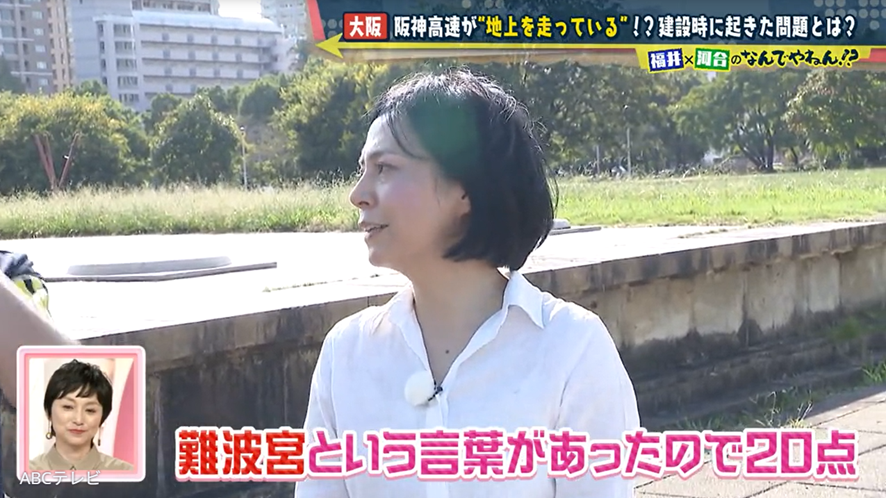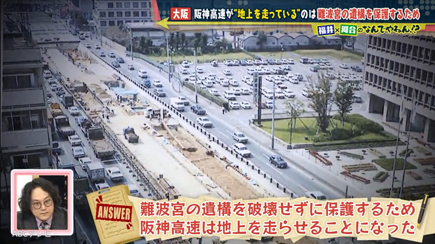 NDYの予想は、どちらもハズレ! 歴史探訪プランナー・森なおみさんいわく、1960~70年代の阪神高速道路建設時に、「ある問題が発生した」ため、法円坂~森之宮の約200メートルの区間を高架にできなかったのだとか。ある問題のヒントは、「大きいモノ」で、「答えはすぐ近くにあります」「めちゃ近にあるので見落とさないように」と、森さんは河合と福井アナにアドバイスした。
