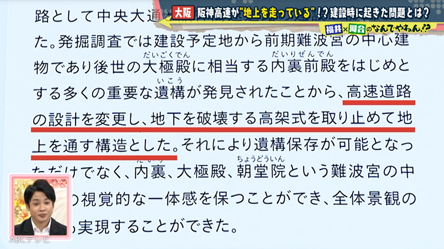 そこで福井アナが、「阪神高速をつくっているときに、難波宮の遺跡の発掘作業も進んでいて……」とまとめだすと、確実に100点をとりたい河合が「それいらないかも」「細かいこと言うと『ここが違います』ってなる」と指摘! そのため最終的に2人は、「難波宮跡の景観を守るため、阪神高速の一部だけが地上を走っている」という予想を立てた。