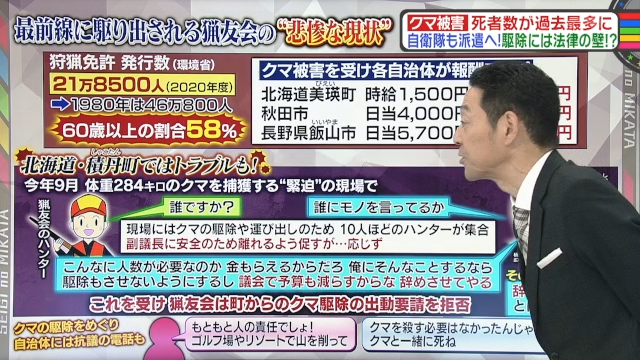 命の危険と常に隣り合わせのクマ駆除は、猟友会頼みなのが現状だ。しかし、肝心の猟友会のハンターは年々減っており、その半数は60歳以上。報酬は決して高くなく、駆除をめぐるトラブルも絶えず、悲惨な状態だ。