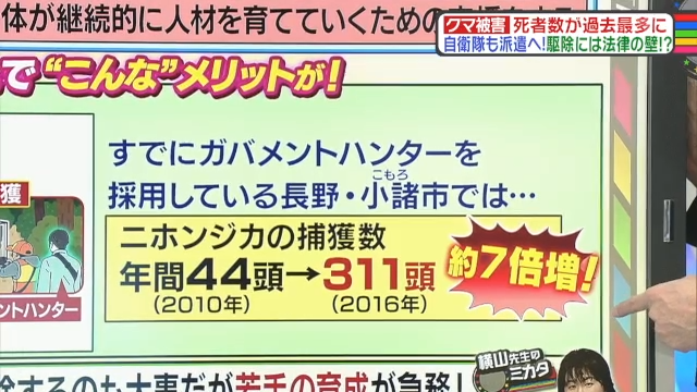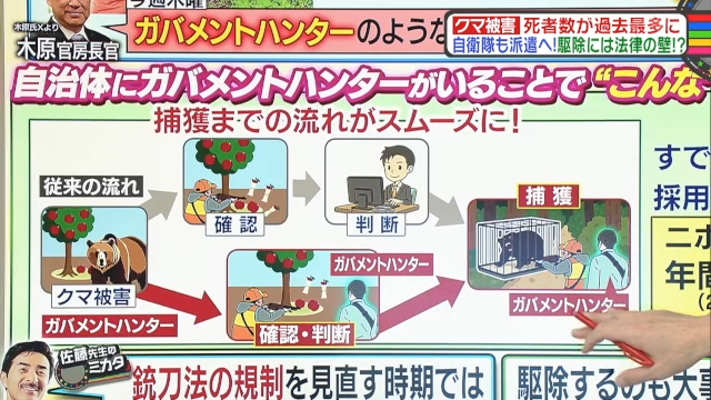 横山教授いわく、「(クマは)放っておくと増えていきますので、ある程度数を減らしていかないと人の生活は守れない」とのこと。そのため彼女は、ガバメントハンターの育成が急務だと考えている。ガバメントハンターとは、狩猟免許を所持していて野生鳥獣対策を行う自治体職員のこと。自治体にガバメントハンターがいれば、クマの捕獲までの流れがこれまでと比べてスムーズになるのだ。