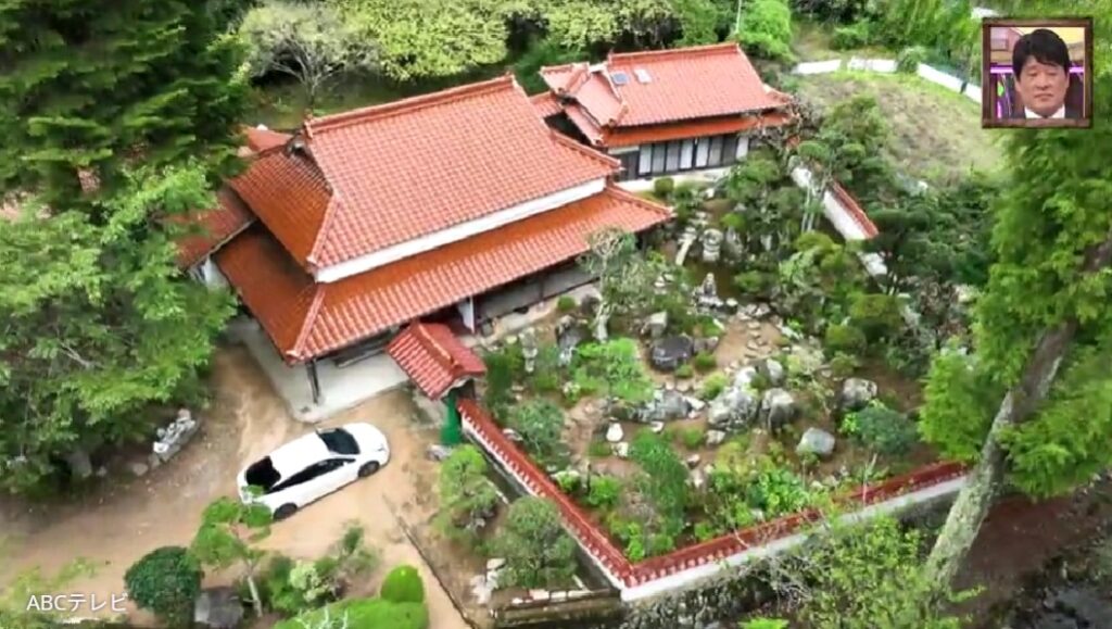 広大な敷地に赤い屋根を持つその建物は、衛星写真越しにも堂々たる風格を漂わせていた。いつものように集落で聞き込みをすると、農作業中の男性が「老夫婦が暮らしている。孫が弟の同級生」ということで、現地まで案内をしてくれた。ダムの上にかかる橋を超えて目的地に到着。そこには手入れの行き届いた広大な和風庭園を持つ、輝く赤い石州瓦が印象的な大きな日本家屋が出現。しかもポツンと一軒家ではあるが、何台も車が止まっており大勢の人の気配があった。