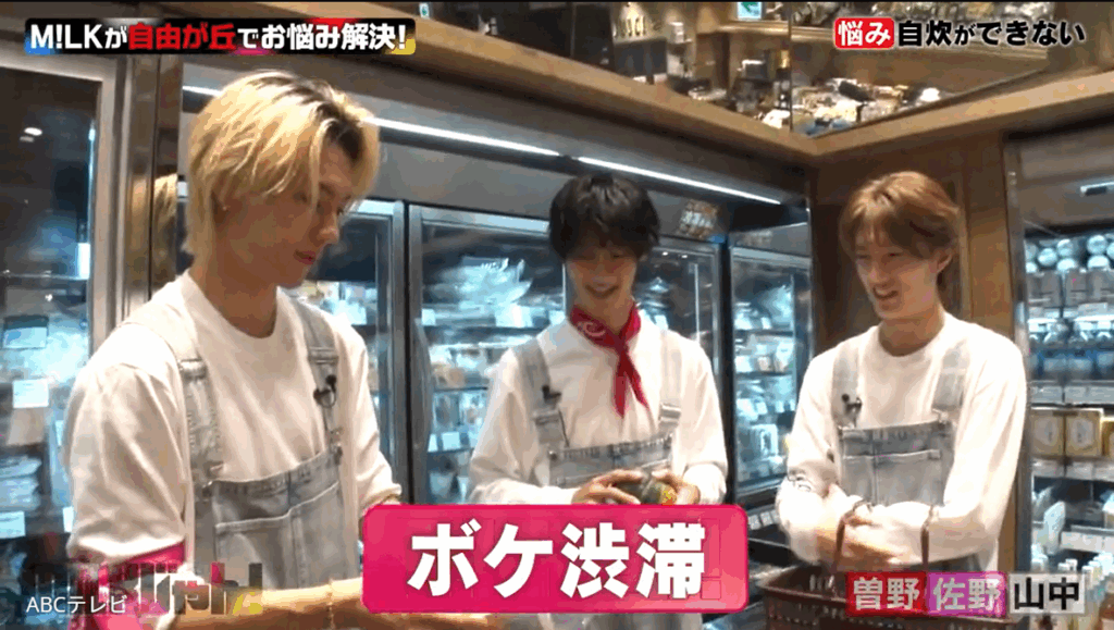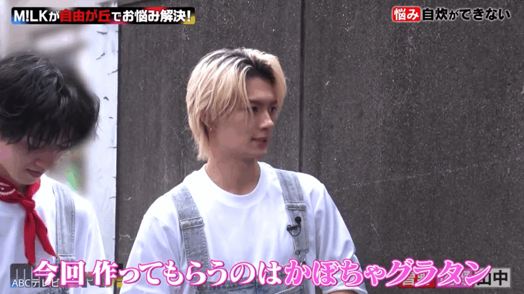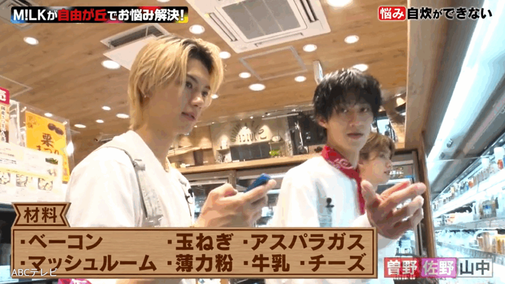 その中で、山中が薄力粉の漢字を読めなかったり、曽野がかぼちゃと完成品のグラタンを持って「食材全部いらないかも!」「(かぼちゃを)くり抜いて(グラタンを入れて)チンしたら30秒でできる!」と言い出したり、佐野がかぼちゃグラタンに絶対使わない食品を大量に持ってきたり……。“ボケ大渋滞状態”を経て、M!LKメンバーはなんとか買い物を終え、食材を持って女子大生たちの自宅へ向かった。