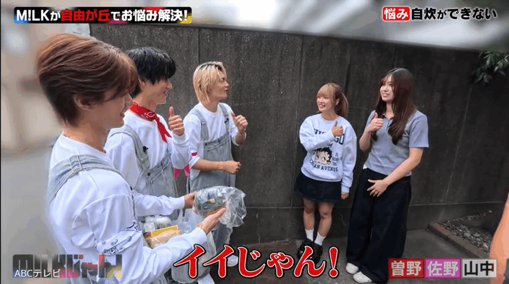 道中で曽野が、「家に上がるわけでもなんでもないけどさ、女の子の家に向かうってドキドキする」と呟くと、佐野と山中は笑いつつも同意。自宅で待っていた女子大生たちは、M!LKのUber Eatsならぬ“ミルクイーツ”に大喜び! 曽野から「これはセンス……?」とたずねられると、「イイじゃん!」と笑顔で答えた。