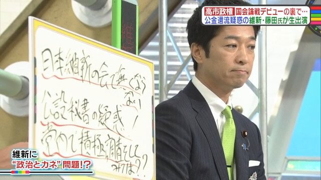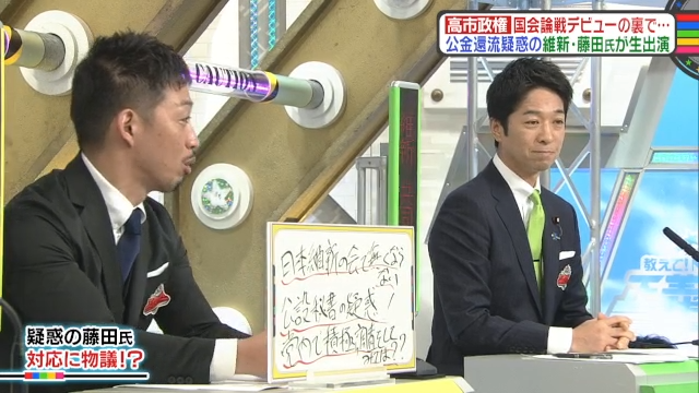 11月8日の生放送番組で藤田共同代表は、改めて「還流ではなく発注」と疑惑を否定。4日の会見とは別人のように物腰が柔らかだったため、MCのタレント・東野幸治から「今日ものすごい低姿勢すぎて」と笑われてしまった。このイジリに藤田共同代表は、「もともと低姿勢なんですけど、会見のときにいろんな質問が飛んできて、私もちょっとイラッとしてしまって、修行が足りんなと思った」とぶっちゃけ、スタジオ一同を笑わせた。
