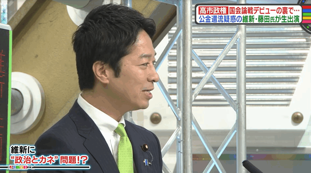 日本維新の会の藤田文武共同代表が、約2000万円の公金還流疑惑について違法性はないと、生放送番組で改めて主張。ケンカ腰の会見とは別人のように低姿勢で、「ちょっとイラッとして」「本当にすみませんでした」と当時の態度について反省した。