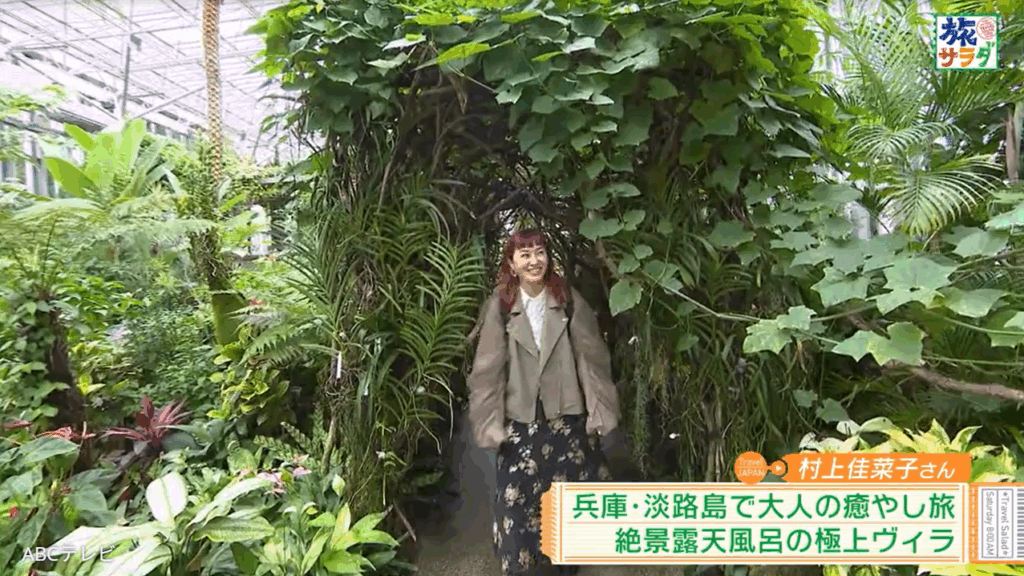 村上は、⽇本最⼤級の温室・兵庫県立淡路夢舞台公苑温室あわじグリーン館で世界中の植物を愛で、生産量日本一を誇る淡路島の名産品・お香を中心に取り扱うセレクトショップ・にいどでオリジナルお⾹づくりを体験。さらに、癒しの禅リトリート施設・禅坊 靖寧(ぜんぼう せいねい)で大⾃然の絶景に包まれながら、⼤好きなヨガで⼼と体をリセットした。