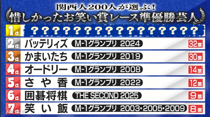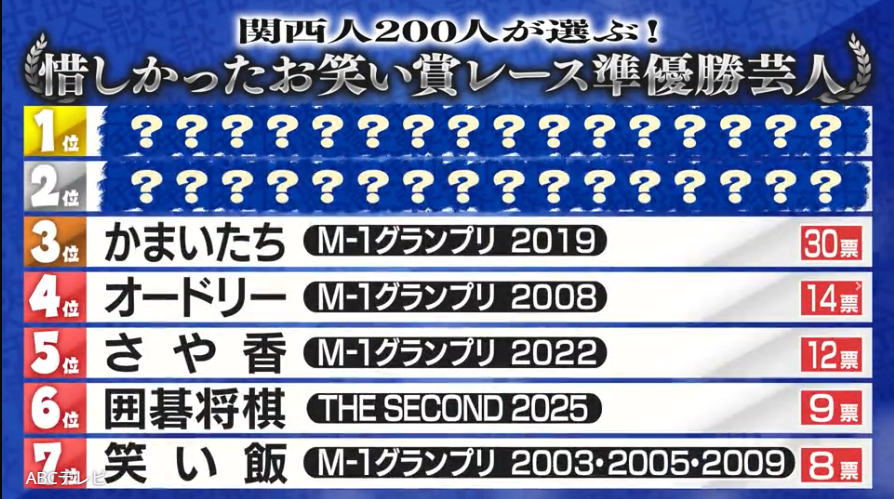 なお、この賞レ−ス準優勝ランキングは、11月12日に放送されたバラエティ番組「これ余談なんですけど・・・」で発表された。