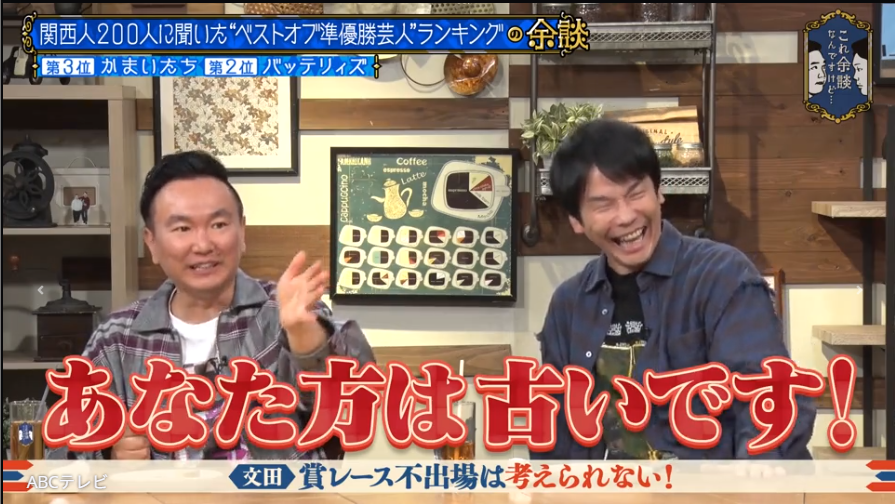 さらに「賞レース出ない若手考えられない。でも今みんな平気でやるもんね」と語ると、濱家は「老害です」とひと言。根津が「恥ずかしいんですけど、もう来年のネタ叩いてる」と明かすと、文田は「俺は売れたいとかじゃなくて優勝したい。売れるとかはどうでもいい。『優勝したら売れません』って言われても優勝したい」と賞レースへの思いを熱弁。濱家は「(バッテリィズと)真逆やん」とコメントした。