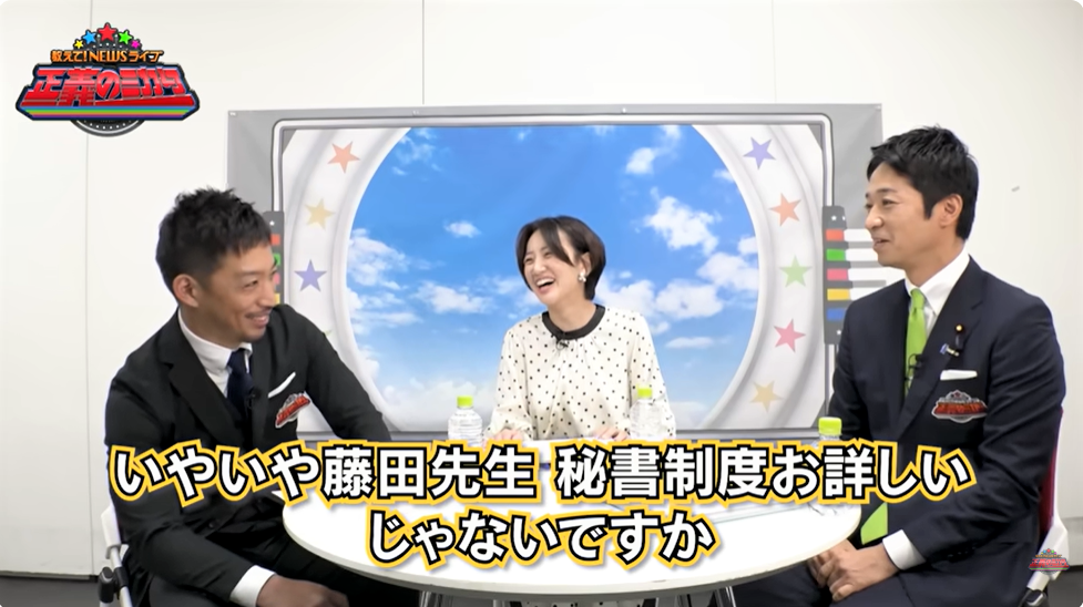 藤田氏は議員になって6年ほど。公設第1秘書の人物は藤田氏が議員になった時から秘書を務めているそうだが、「友人関係で言うともう20年近い」と藤田氏は付き合いの長さを語る。西田氏に「すごいシゴ出来の(仕事が出来る)方なんですよね?」と問われて頷いた藤田氏は、その人物の仕事を「コンサル業みたいなことをしてる」「いろんな会社を支援したり、自分もその店舗をプロデュースしたり、プロジェクトをマネジメントしたりとか」と説明し、そうした仕事に「だいたいまつわってくる」ビラなどを手掛けたりしていると話した。