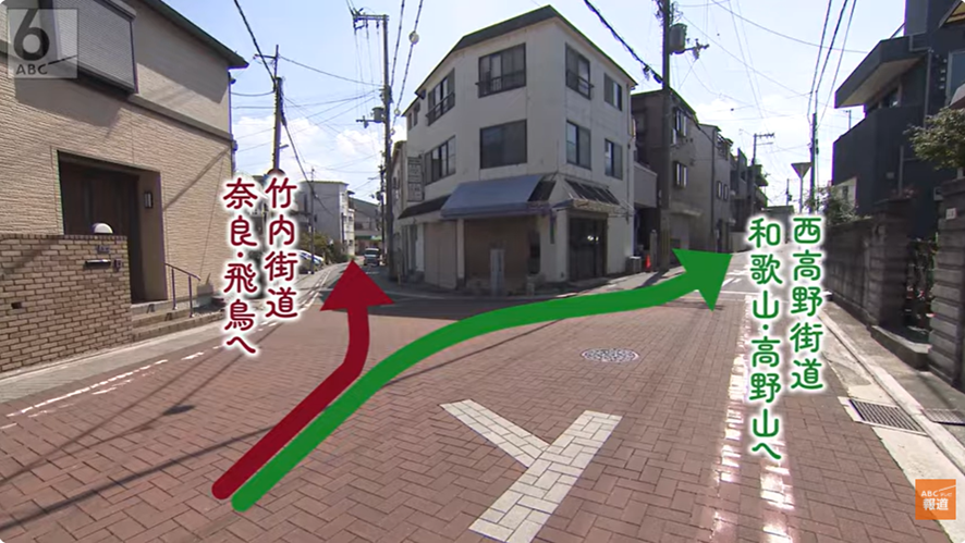 住宅街をしばらく歩いていると、分かれ道を発見! その真ん中にある石碑には、“竹之内街道”“西高野街道”と2つの街道の名前がなぜか一緒に刻まれています。これは一体どういうことなのか? 2人は大阪の歴史にくわしい方に電話でたずねることに。