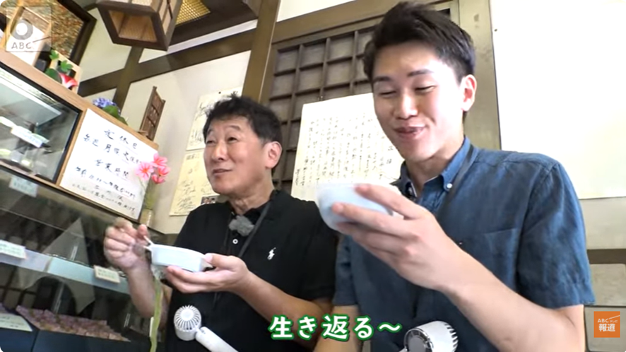 しばし古墳を見て気が済んだのか、再び竹内街道へ。そろそろお腹が空いてきた2人が見つけたのは、昔ながらの和菓子屋さん。笑顔で迎えてくれたやさしいご主人から、名物の「くるみ餅」や「生キャラメルプリン」をいただき、柴田アナと中村アナは「生き返る〜!」「染みわたる〜!」と感激しきりです。