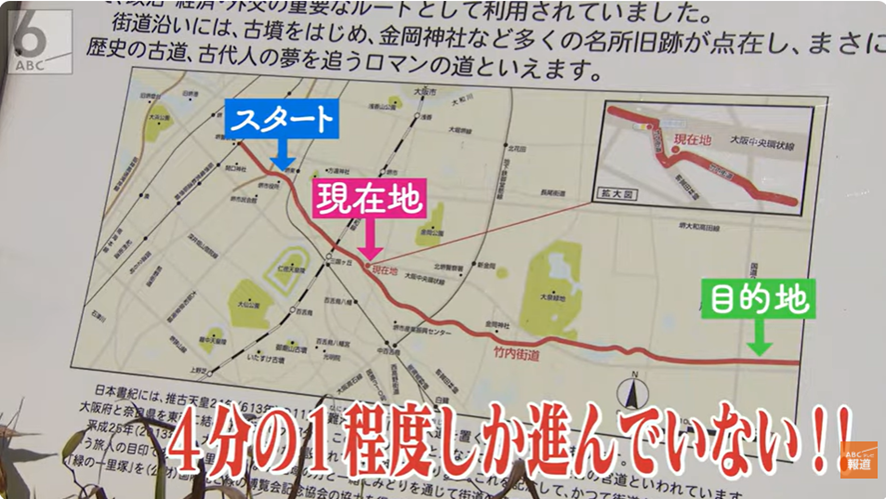 ここでしっかりとパワーをチャージし、ようやくしゃべ歩きを再開させた2人。10分ほど歩いたところに竹内街道の石碑と案内板を見つけます。ここに記されていた街道の地図を見ていた中村アナ。「ちょっと恐ろしいことを見つけちゃったんですけど…」と衝撃の事実に気づきます。