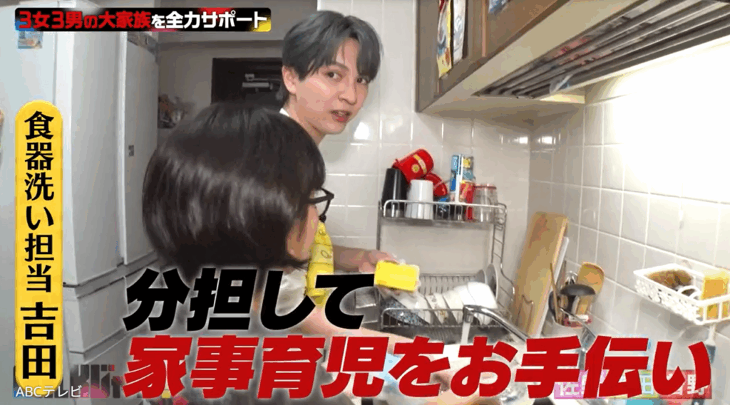 買い物後も、H妻にはやることがたくさん。しかし、子どもたちの面倒を見ながらだと「とにかく家事が進まない」という。そこで佐野勇⽃、曽野舜太、吉⽥仁⼈は家事を手伝うことに。3人はあっという間に大量の洗濯物を畳み終えると、3手に分かれてさらにH妻をサポート。佐野は三男のおむつを替え、曽野は三女の宿題を見てあげ、吉⽥は次女と協力して大量の皿を洗った。