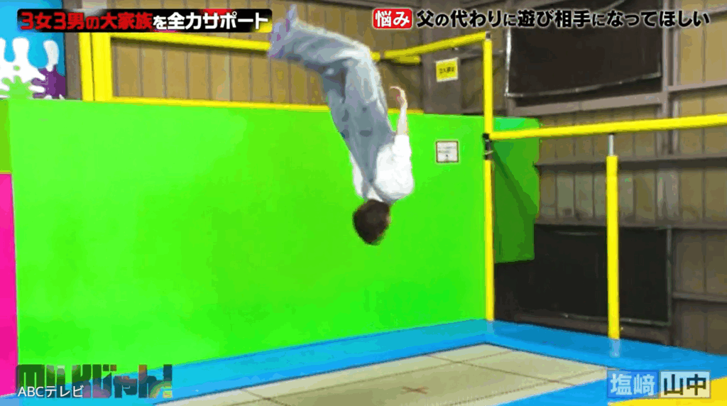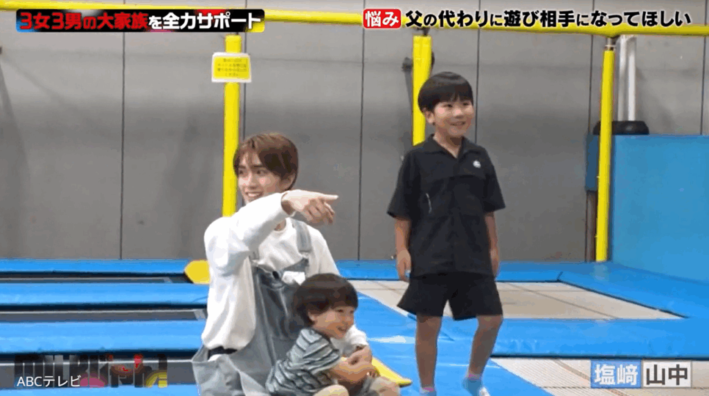 そのころ塩﨑太智と⼭中柔太朗は、体力が有り余っている長男と次男の遊び相手に! トランポリン施設で子どもたちと元気いっぱいに遊び、運動神経のよさを生かした大技を披露してみせた。