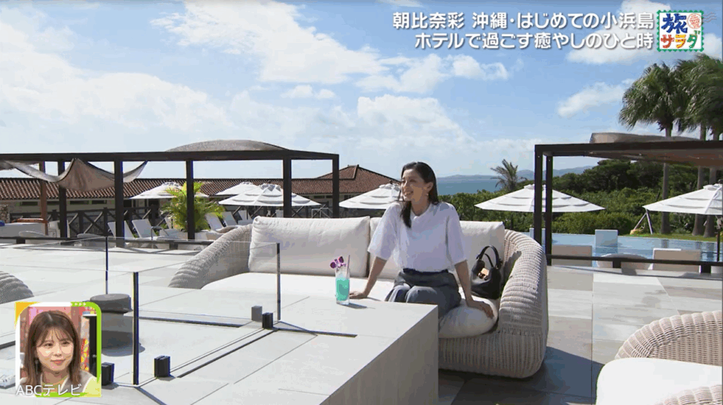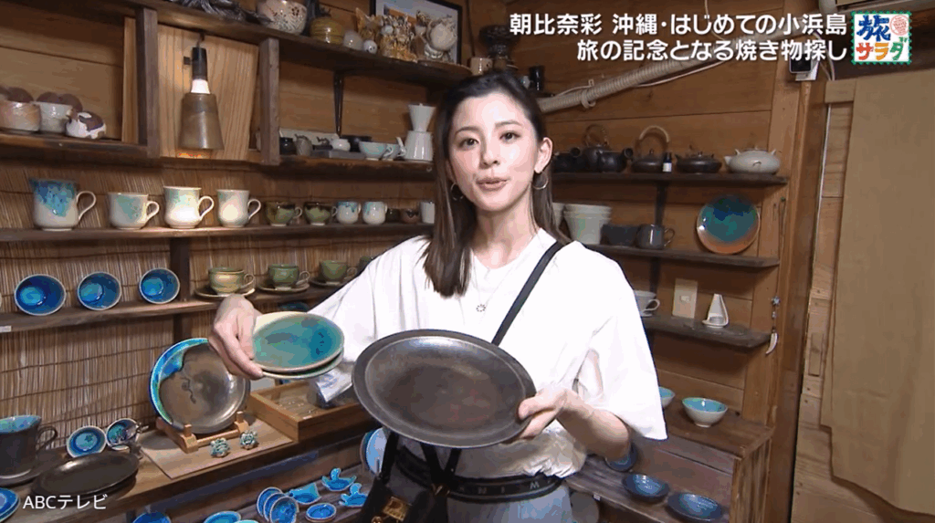『朝だ!生です旅サラダ』初出演の朝比奈が旅したのは、⽯垣島からフェリーに乗って約30分で到着する小浜島だ。朝比奈は、癒しを求めて島内をのんびりと散策し、ラグジュアリーなリゾートホテルにステイ。ソーキそばや黒糖アイスといった島グルメを味わい、旅の思い出に陶芸⼯房で素敵な焼物を購入した。