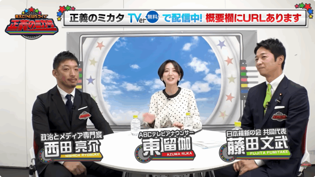 最強専門家がニュースの正しいミカタを徹底解説する情報バラエティ番組「教えて!ニュースライブ 正義のミカタ」(ABCテレビ)。東留伽アナがMCを務める番組公式YouTubeチャンネル「正義のミカタチャンネル」で、社会学者の西田亮介氏と日本維新の会・藤田文武共同代表が、維新の政策についてトーク!