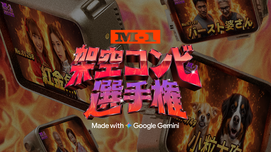 M-1公式サイトの「M-1架空コンビ選手権」ページに、ご自身の写真をアップロード。Google Geminiが画像を解析し、M-1に実際に出場したかのような架空のコンビ写真とコンビ名を生成します。2人組の写真をそのまま使ったり、1人ずつの写真を組み合わせてコンビにしたり、遊び方は自由!ご自身のみの写真の場合は、AIが自動でユニークな相方を生成します。また、コンビのキャッチコピーやコンビ情報なども同時に生成され、誰でも漫才師になりきって楽しむことができます。