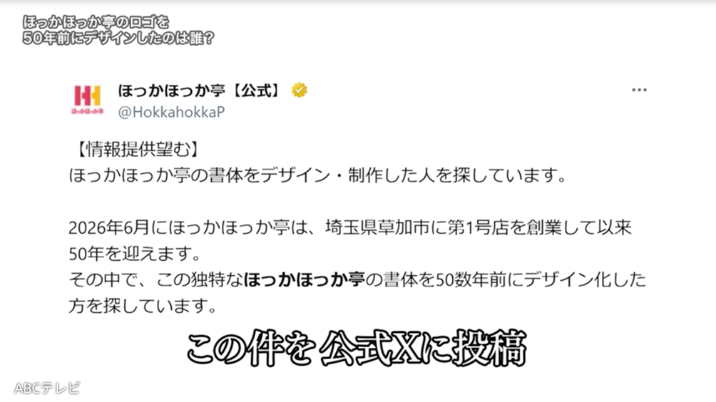 『探偵!ナイトスクープ』(ABCテレビ)に、お弁当チェーンの「ほっかほっか亭」総本部から、店名ロゴの書体をデザイン・制作した人を探してほしいという依頼が届く。Xの公式アカウントから情報提供を求める投稿をしたところ、17万を超える「いいね」が付いたはいいが、真偽不明の情報も大量に届き、社内はお手上げ状態になってしまったとのこと。担当する桂二葉探偵が、ほっかほっか亭総本部への聞き取り調査から開始した。