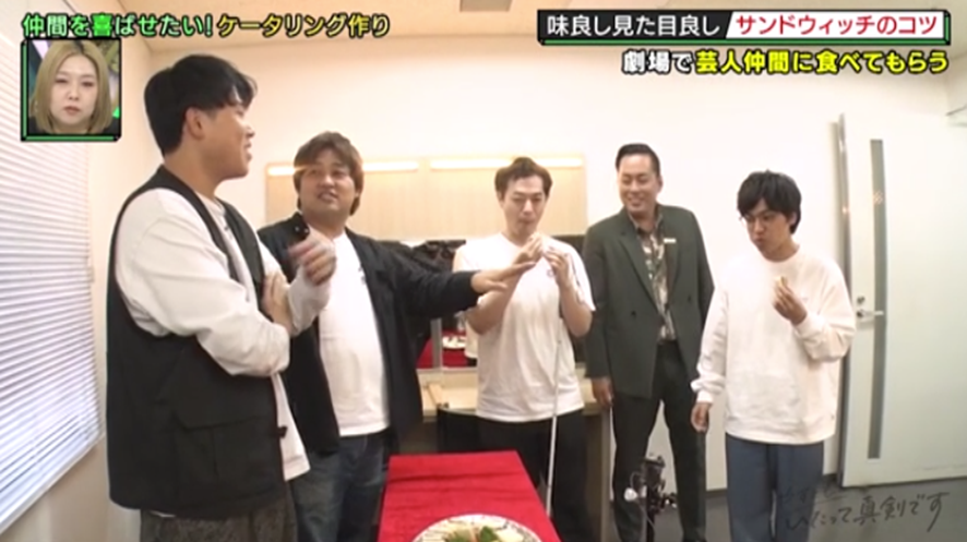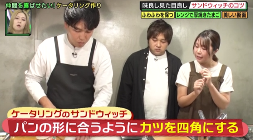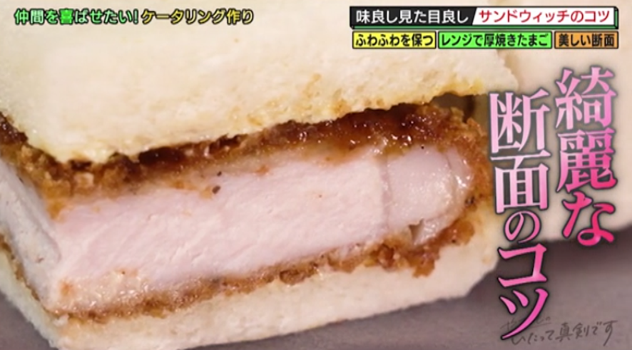 そのほか、カツサンド作りに欠かせない豚肉の下ごしらえや、電子レンジだけで作るフワフワ卵焼きのレシピなど、今すぐマネしたくなるプロの技が満載! これらをすべて押さえ、完成した東特製サンドウィッチにマンゲキ芸人たちの反応は?