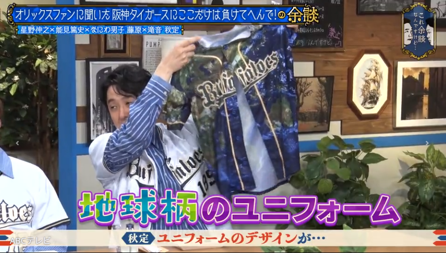 さらに秋定は、「(オリックスは)ユニフォームのデザインが斬新で毎回変わるんですよ」と、持参したユニフォームを見せながらプレゼン。「例えば、こういう地球柄のユニフォームが(観戦)チケットを買ったら無料で貰えるんですよ。これ毎年デザインが変わってて。これが終わったら、次の年に宇宙柄のユニフォーム出すっていう」と解説。