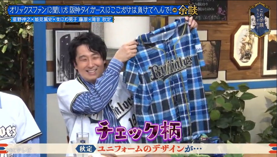 「(その後も)色々あって、1回もうなくなったんやと思うんですよたぶん(ユニフォームのアイデア)案が。でチェック柄出してみようっていうことで」と話し、秋定は青いチェック柄のユニフォームを紹介。するとオリックスのエースとして活躍し、投手コーチも務めた星野伸之が「僕これコーチ時代に着てるんですよ」とカミングアウト。
