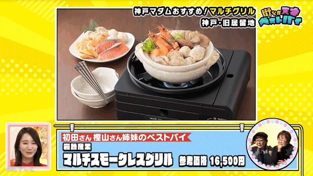 「双子だとよく言われる」ほどそっくりな女性2組は、82歳と77歳の姉妹。一緒に暮らしており、よくケンカをしながらも「今、2人で幸せ」なのだとか。彼女たちのベストバイは、カセットガスで知られるイワタニのマルチスモークレスグリル。焼肉、鍋、たこ焼きなど、1台でマルチに活躍する便利なグリルコンロです。焼肉の際は、イワタニ独自の構造で煙を抑えられます!