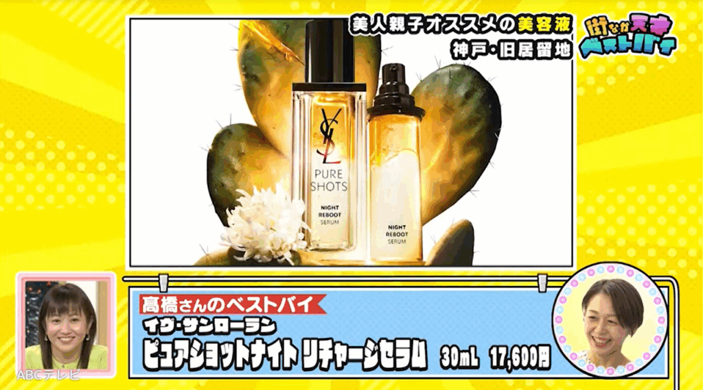 美人親子のベストバイは、イヴ・サンローランのピュアショットナイトリチャージセラム。“8時間熟睡の美肌”を目指した、夜に塗るのがおすすめの美容液で、イヴ・サンローランの中でも“伝説のNo.1美容液”と名高い商品です。無印良品の美容液を普段使っている美人ママは、このセラムをスペシャルケアとして取り入れているそうで、「高いけどすごいよかった」と教えてくれました!