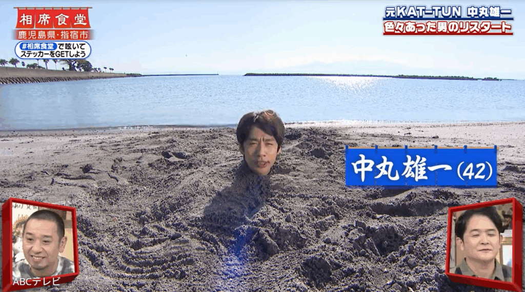 そんな中丸は、⿅児島県指宿市の海岸の砂浜に顔以外埋まった状態で、今まで通り「おはようございます~!」と元気に挨拶! とんでもない姿で登場した中丸にお笑いコンビ・千鳥は、「ウソやろ!?」「素晴らしい!」「覚悟が見えます!」と思わず拍⼿した。