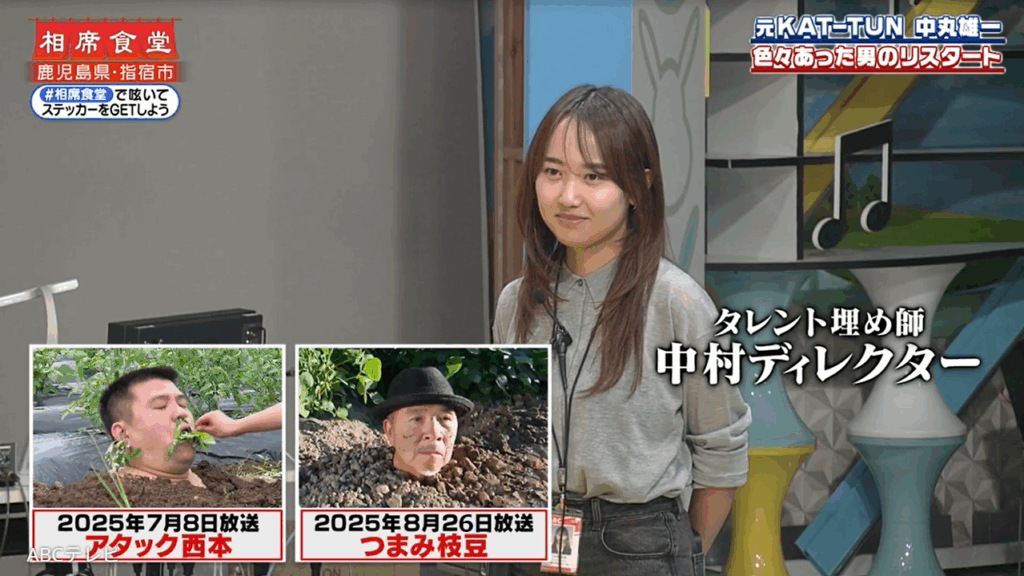 衝撃的なオープニングを考えたのは、『相席食堂』のロケで名だたる芸能人を地中に埋め、千鳥から「埋め師」と名付けられた新人女性ディレクターだ。なんと埋め師ディレクターは、オープニングだけでなく、さつまいも畑での収穫体験中にも中丸を地中に埋めた……!