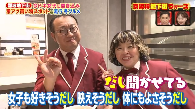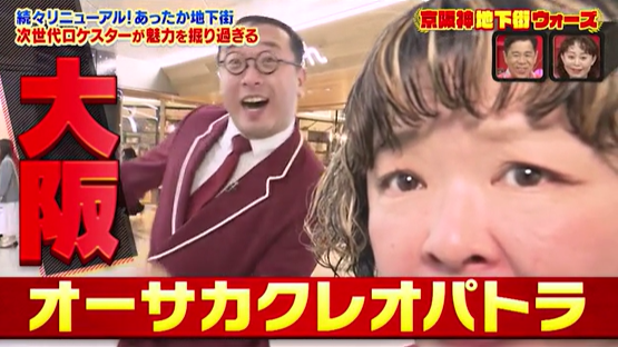 オーサカクレオパトラは、調査前からボケてツッコミまくり! りえちゃんが、「かわいい女子代表じゃないですか、私がね!」と話し出すと、かつのぶさんはすぐに、「どこがやねん! かわいい女子って」とピシャリ。「かわいい女子は(地下街を)こう歩くんだよというのをお伝えしたい」と、りえちゃんがリポートではなくモデルウォークをしだすと、「その“歩き方”かい!」とかつのぶさんは即ツッコんだ。