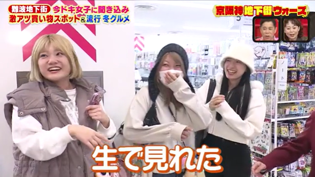 そんなオーサカクレオパトラは、イマドキ女子たちに難波の地下街のおすすめショップとアイテムを聞いてみることに。なんばウォークで、女子高生から「SNSでバズっているメイク前にするパック」を教えてもらったあと、オーサカクレオパトラは自分たちのファンらしき若い女性たちに出会った。
