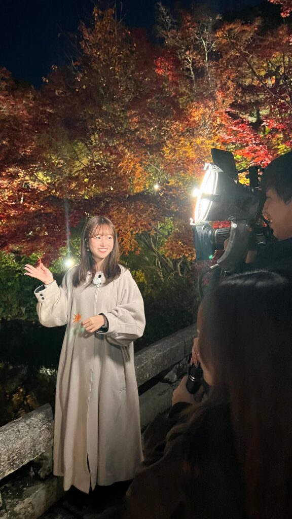 こんにちは、ABCテレビ新人アナウンサーの久保光代です。今回は、「newsおかえり」で、京都屈指のモミジの名所、永観堂 禅林寺から生中継しました。境内では、なんと3000本ものモミジが楽しめるのですが、永観堂 禅林寺は創建が平安初期の853年で、その歴史は1000年を超えるすごい場所なんです。
