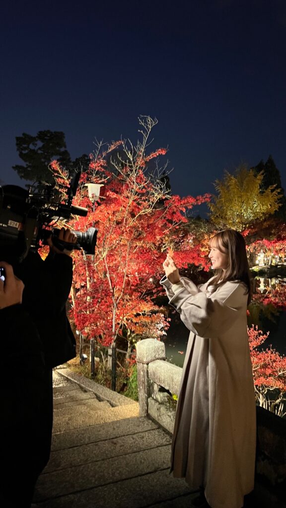 個人的には「おかえり」でもご紹介した、池に映る“逆さモミジ”が非常に幻想的で素敵でした。映像でもうっとりするような景色だったと思いますが、現地で池の端から端までを眺めると、映像とはまた違った感動が生まれます。中継が終わった後、普段はスタッフも含めてすぐに撤収するのですが、今回は終わってからもしばらくの間、みんなで写メをいっぱい撮っちゃいました。