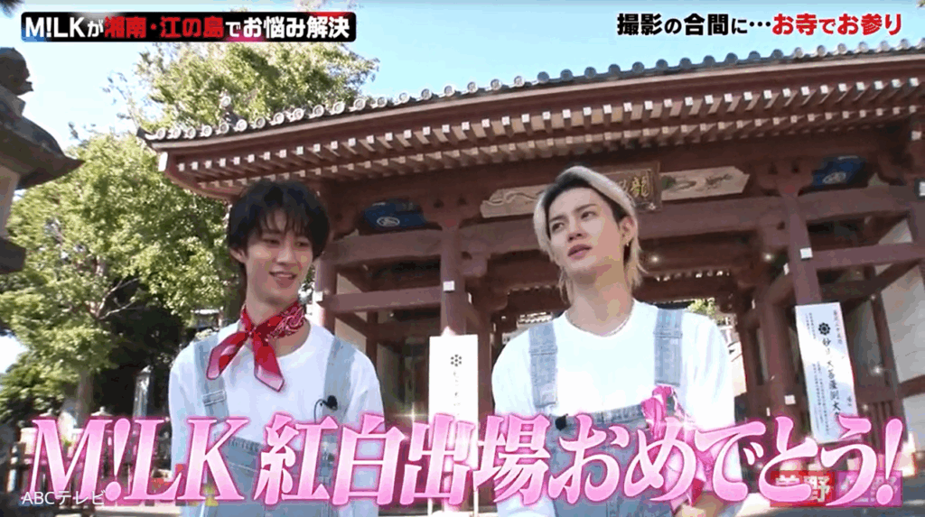 さのそのコンビは、神奈川の湘南・江の島エリアでのロケの合間に、龍口寺の境内へダッシュ! 10分後に戻ってきて、「今年のM!LK紅白出場の願いを込めて2人で(鐘を)鳴らしてきました!」とスタッフに明かした。