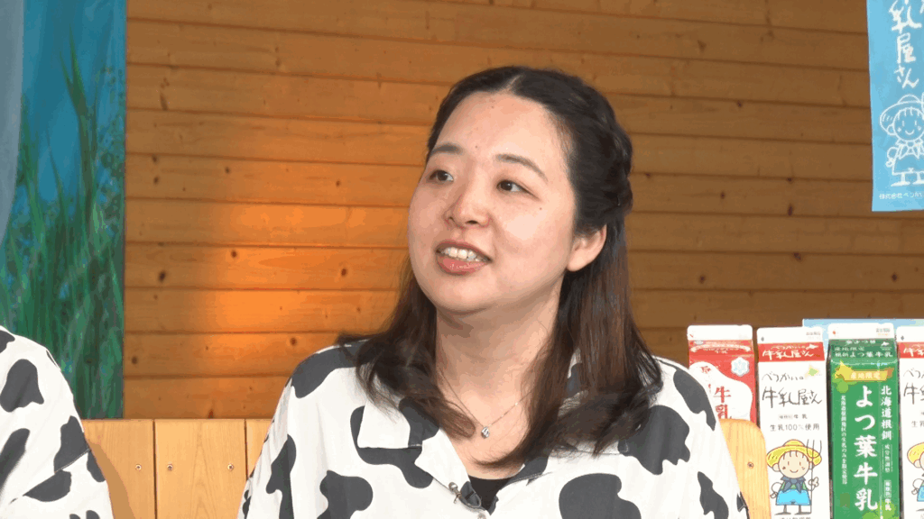 その後、始まった新婚トークは、今回も「べつかい乳業興社」からお届け。夫が別海町で父と営むのは、約60ヘクタール=東京ドーム13個分もの広さの牧場で、約100頭の乳牛を飼育。搾乳は1日2回、掃除・餌やりは1日3回を早朝から年中無休でこなしている。