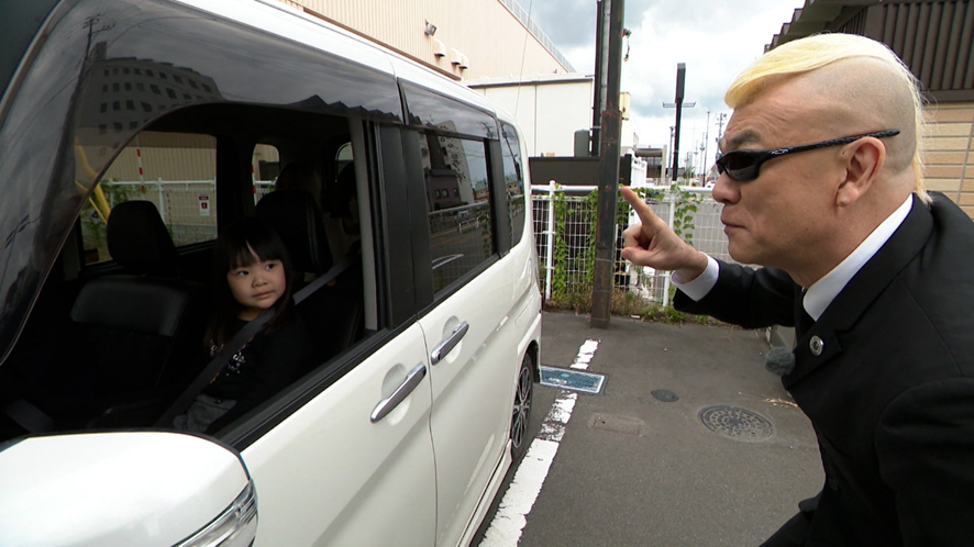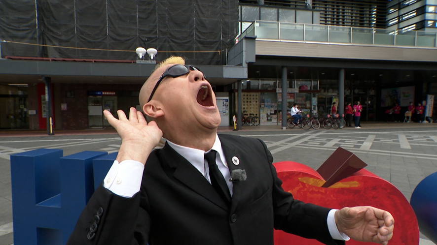 まずは相席するために街を散策。すれ違う人たちにパントマイムで笑いを振りまく姿はまさにサイレントコメディ。街で遭遇した女性に「青森の名産が食べられる所を教えて」とパントマイムで伝えると、人気の市場に案内してくれる。市場ではお父さんとパントマイムで会話し、弘前のソウルフード“イカメンチ”をご馳走になる。