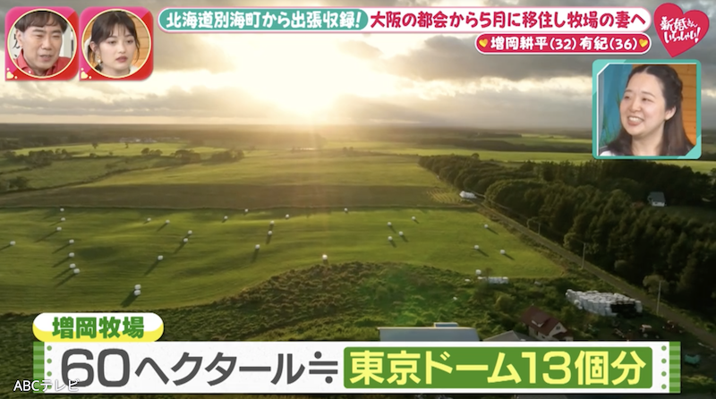 夫は、地元・別海町の酪農家。夫の父と親子で営む牧場は、東京ドーム13個分という広大な土地に、1.100頭近くの牛を飼育しているという。この牛たち、夫が独特な鳴き声を呼ぶと、ぞくぞくと寄ってきてくれるのだ!