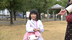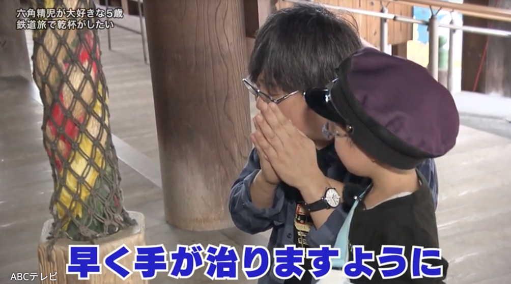 水間観音での参拝で、左手を骨折して手が合わせられない5歳児の手を、六角が両手で包むように手を合わせる。優しい。