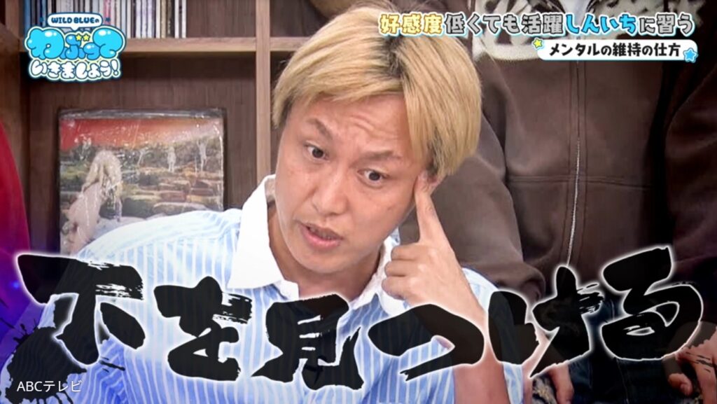 WILD BLUEの池田優斗に「メンタルはどう維持してるんですか?」ときかれたしんいちは、「自分がやらかしたことなんてちっぽけなもん。自分よりやばいことをやった、消えかかってる芸能人…“下”を見とけばメンタル保てます」と独自理論を展開。そしてM-1グランプリで最下位になったMCの東京ホテイソンを指し、「自分はまだマシだ」と認識することで精神的な安定を得るという。しかしこの方法は人間的に「ヤバい自覚あり」といい、そのために「家族のグループラインも外されました」という。