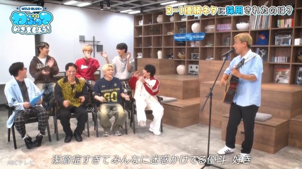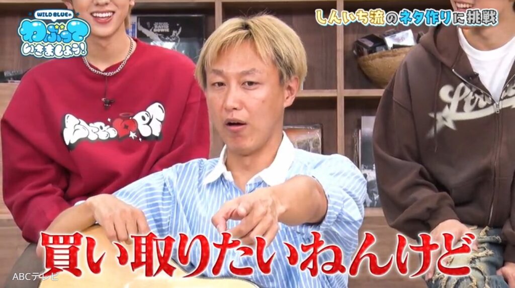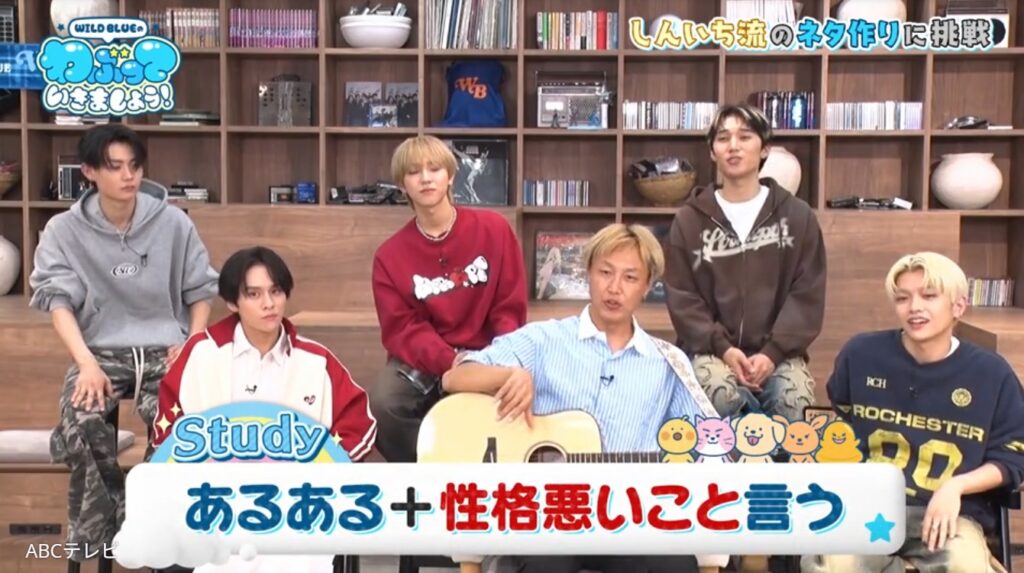5人組ボーイズグループWILD BLUEの初冠番組『WILD BLUEのわぶっていきましょう!』(ABCテレビ)。11月30日(日)放送回では、2022年のR-1グランプリを制し、破天荒すぎる言動で「クズ芸人」として人気を博しているお見送り芸人しんいちが、芸能界で生き抜くための後輩力と、R-1優勝ネタ「僕の好きなもの」を用いたネタ作りの核心をWILD BLUEに伝授した。