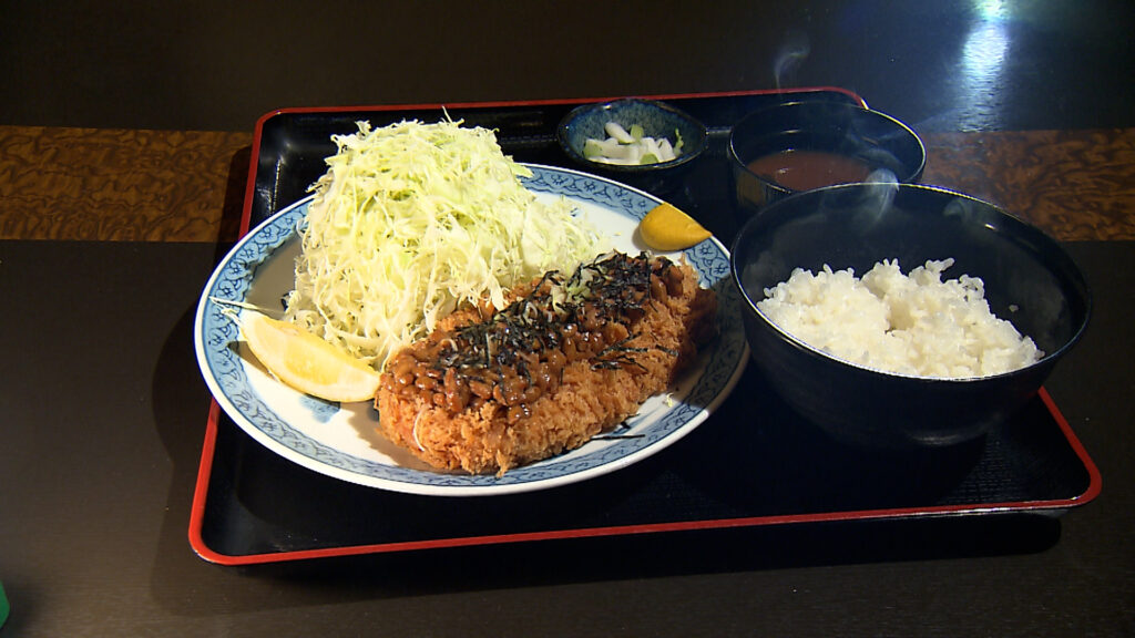 和食の納豆グルメが食べられるのはとんかつ専門店。とんかつの上に納豆とノリとネギがてんこ盛りになった料理は、洋食店のゲームで末澤が完成させたアレンジにそっくりで、末澤は「俺が作ったみたい」と驚く。