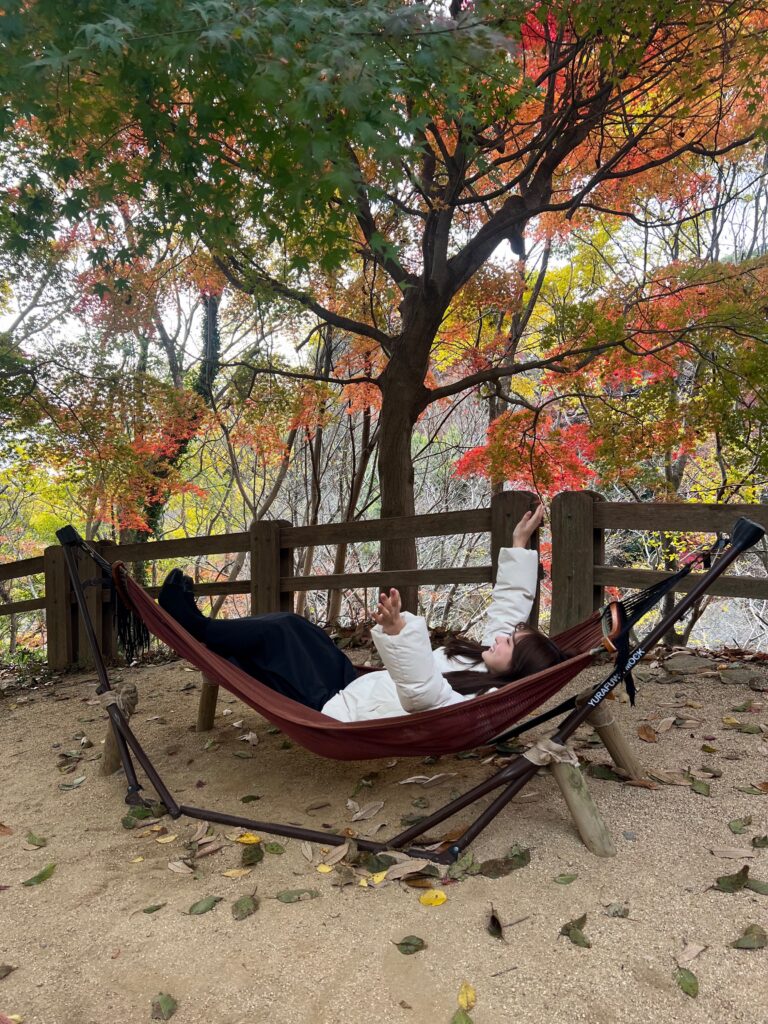 園内ではモミジが見ごろで12月15日からクリスマスまでの間、ナイター営業をしているのでライトアップされた紅葉を楽しむことができます。風が吹くとモミジのシャワーが降ってくる感じで素敵でした。もちろん、ライトアップされているモミジも綺麗なんですが、お昼間に訪れても日の光に照らされた素晴らしい紅葉が見られるのでおススメです。