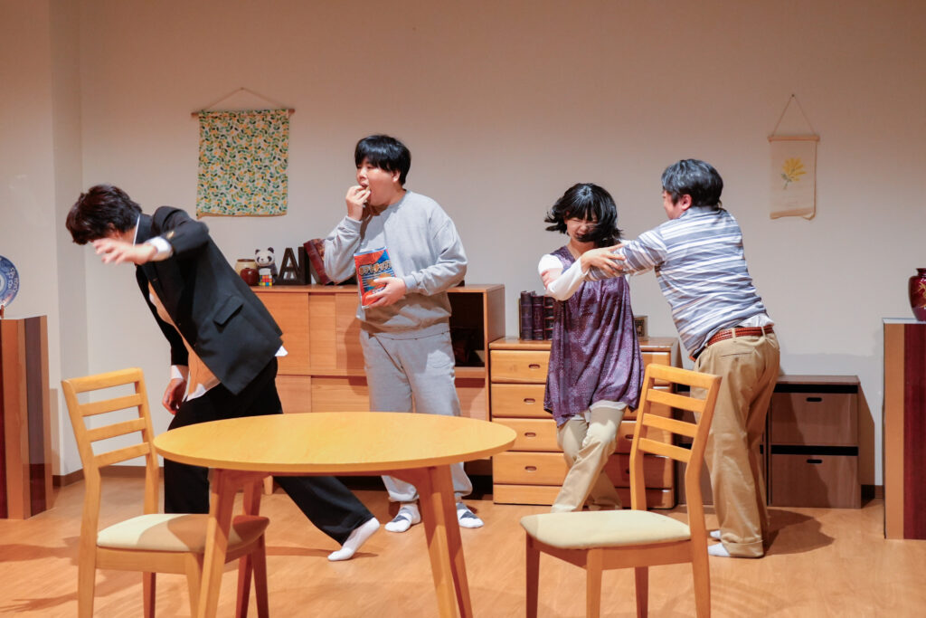 「家族」は、父親(ケツ)と息子(辻)の激しい口げんかからスタート。揉み合いが始まると、BGMに「僕たちの失敗」(森田童子)が流れ、2人の様子に異変が生じ…。そしてオカン(イワクラ)が仲裁に入り、さらには引きこもりの息子(中野)も闖入すると…!? 4人のマイムを斬新な演出で魅せる、独創的なコントが誕生した!