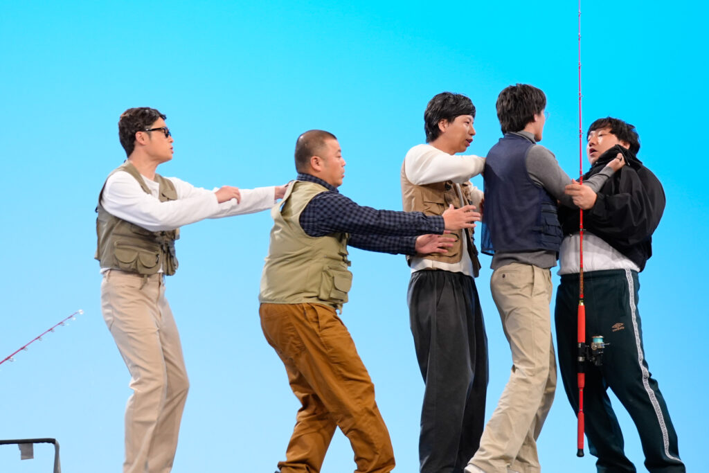 「釣り」は釣り人たちが織りなすカオスなコント。海辺で竿を垂らしている大須賀に、釣竿を持った兎が「こんにちは。釣れますか?」と声をかけると、まさかのリアクションが…。面食らっていると、大須賀の釣り仲間(堂前、肥後、辻)が現れて、さらに理解不可能な展開へ。兎が困惑していると、遅刻した友人のケツがヘラヘラと登場し、兎のイライラはマックスに…!